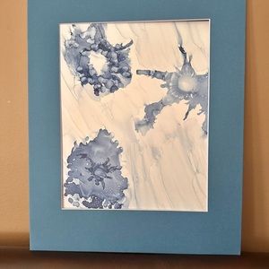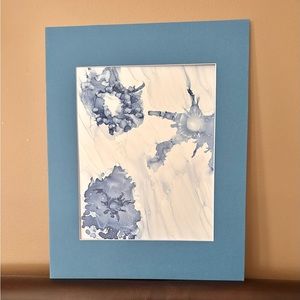 Shades of blue splash across the page of this hand crafted original abstract alcohol ink painting. It has been placed in a blue mat and ready to be framed. Frame not included. This blue splash of color would look great in any room of your house, cabin, apartment or dorm. First photo gives an example of what it would look like displayed, image may appear larger to show detail