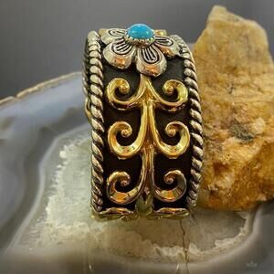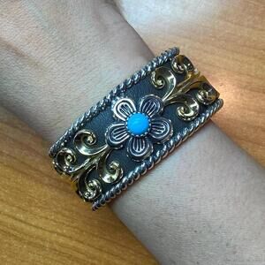 Beautiful Carolyn Pollack Vintage Sterling Silver and Brass, Wide Dark Brown Leather Band With 1 Round Turquoise Cabochon Decorated Flower Bracelet For Women.