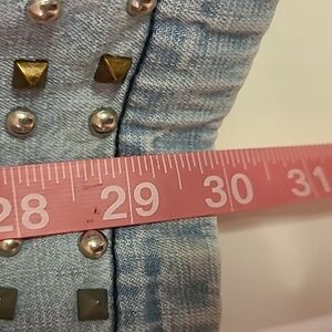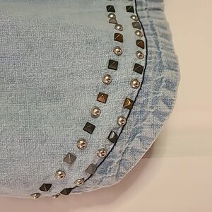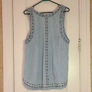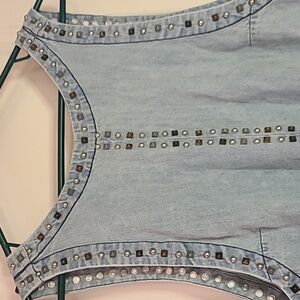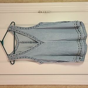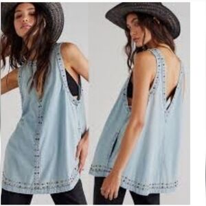 Free People light wash chambray sleeveless tunic featuring silver stud embellishments along neckline, arm openings, center front seam, and hem. Flowy, relaxed A-line fit with edgy detailing and open back design. Lightweight denim look — perfect layered over a bralette, tank, or swimsuit.