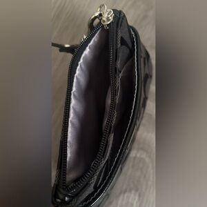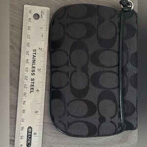 Chic Coach wristlet with signature pattern. Sleek black design. Ideal for any outing.