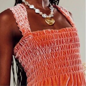 Elegant velvet dress in coral. Features ruffled straps and a flowing silhouette. Perfect for special occasions. Soft & Stretchy Will Fit Size Small.