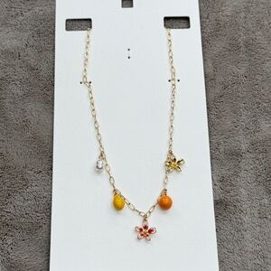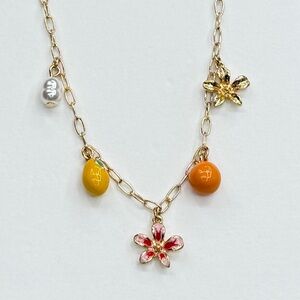 DESCRIPTION: This is a gold-tone necklace featuring summer themed charms including an orange and lemon with flowers.