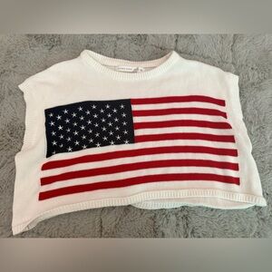 Sleeveless sweater with American flag design. Features red and blue flag on white background. Perfect for casual wear.