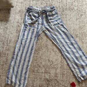 Casual cargo pants with blue and white stripes. Features multiple pockets and a relaxed fit.