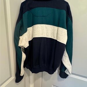 Rare retro color-blocking in Navy Blue, Teal Green, and Cream.