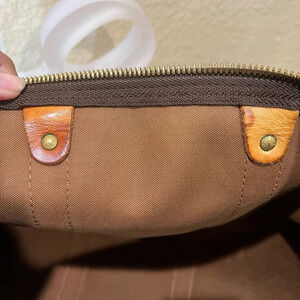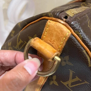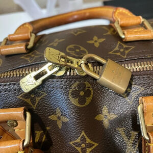 Versatile travel bag. Marks on the vachetta leather (patina). No long strap. Stain on the inside. No rips or tears. Perfect size for overnight or carry on. With padlock but no keys.