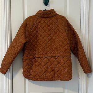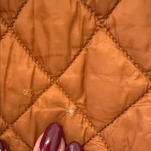 Stylish quilted puffer jacket. Warm and cozy, but not too heavy. Has a couple of flaws (in pics) but good condition and all zippers work.