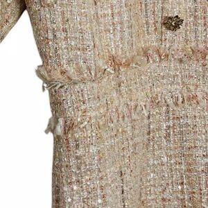 Mac Duggal. High neck 3/4 Sleeve Beaded Trim Midi Dress Chic tweed pencil dress with button details. Features three-quarter sleeves. Ideal for elegant occasions. Wore for a 2 hour bridal luncheon one time. Excellent condition.