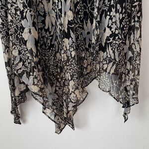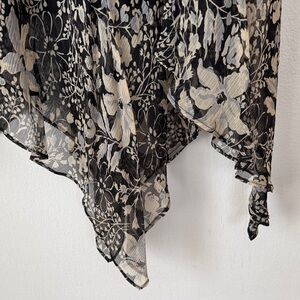 Elegant asymmetrical silk tiered flowing midi skirt with floral pattern. Black, cream and pale blue colors. Elastic waistband for comfort. Shear design with black lining. Very flowy. Perfect for any occasion.