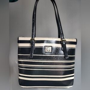 Elevate your everyday look with this chic Anne Klein handbag featuring a classic beige‑and‑black color palette. The vertical stripe design gives it a modern, eye‑catching look, while the gold‑tone hardware and signature emblem add a touch of elegance.