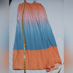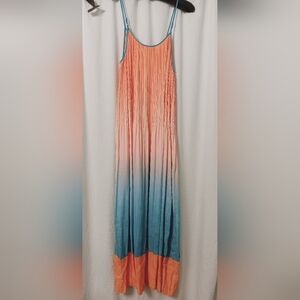 Stunning maxi dress with a gradient design. Features shades of orange, pink, and blue. Perfect for a vibrant look.