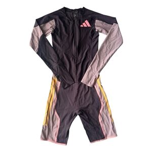 Design: A high-performance, long-sleeve speedsuit designed for track and field athletes. It features a colorblock design in dark gray, black, and light gray with yellow/orange accents and the iconic Adidas logo.