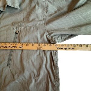 Stay cool and comfortable with this Patagonia men’s button-up shirt in size Large. Features a lightweight, breathable material with subtle gray pinstripes, dual zippered chest pockets, and a vented mesh-lined back — perfect for hiking, fishing, camping, and travel!