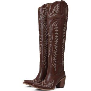 Women Over The Knee Western Boots Classic Embroidered Chunky Heel Slip On Brown