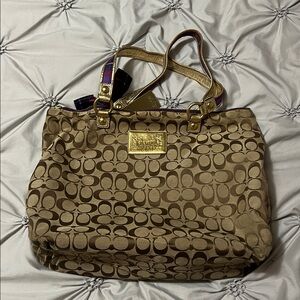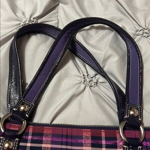 Stylish Coach shoulder bags in classic tan and purple tartan. Perfect for any occasion. Elevate your look with these chic accessories. GUC, purple is in better shape than tan. Poppy hang tag and badge on purple, no rips or tears. Handles are great condition! Classic tan is a little dingy from use, includes tartan scarf and gold and purple hang tags. Some discoloration on inside near zipper pouch and overall could use a good cleaning. No rips or tears, handles have gold flaking off underside but doesn’t affect use! All zippers work (front, top and interior) All gemstones intact on classic tan, tartan printing is all intact. PLEASE ask questions before purchase, no I will not separate them. Smoke free pet friendly home. Both bags are approximately 16 in wide and 12 inches tall, handles are approximately 8 inches