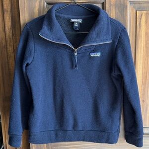 Wool zip-up sweater by Patagonia. Features a deep blue color. Ideal for layering. Worn a couple of times.