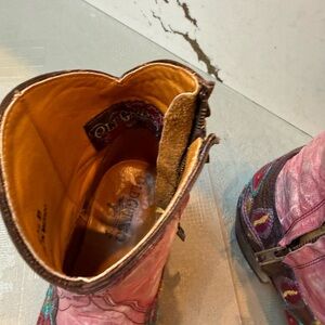 Chic pink and brown boots with floral embroidery. Unique western style. Perfect for any occasion. Great used condition.