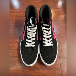 Vans BMX Sk8-Hi. These hi-top shoes are brand new in the box and have never been worn or used. They are a mens 10.5. The color is listed as Black / Magenta. Suede and canvas upper. The vans tag is not included. Laces are tied how they came from the manufacturer.