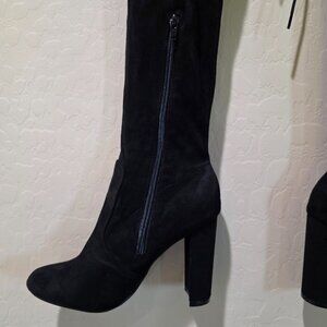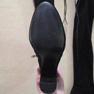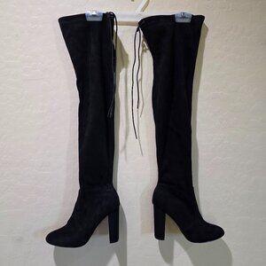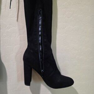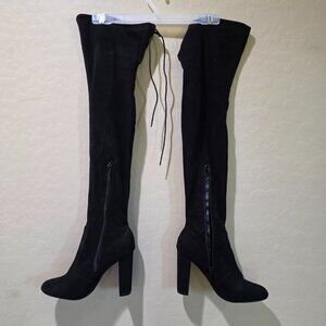 Black faux suede over-the-knee boots with a sturdy block heel and a signature tie-back detail that helps keep the shaft in place.