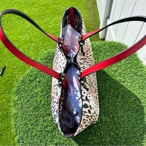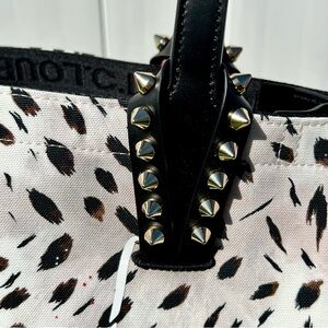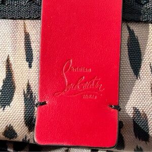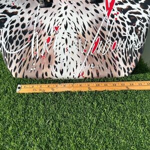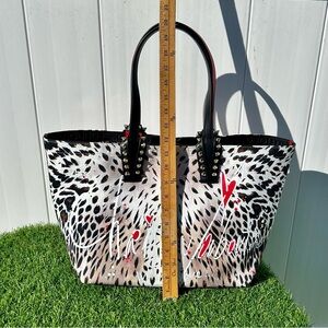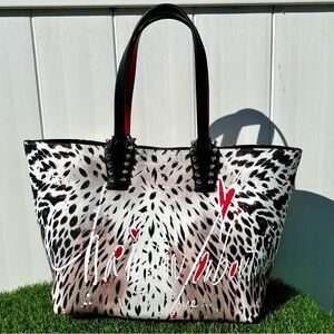 This Stylish and versatile tote is crafted in Gigi white, black and beige animal print canvas, perfect to make a statement. It is adorned with the distinctive “From Christian Louboutin with Love” signature logo and splashes of Loubi red. The black leather double handles and trims add a touch of luxury. This is the medium/large version of the versatile Cabata tote. It has a rectangular base of approx. 14” by 8”, with a top length of approx 18.5” and height of approx 12”. It has an interior pocket and magnetic closure, and can be carried on the shoulder or by hand.
