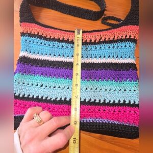 Chic crochet hobo bag with vibrant stripes. Features a mix of black, blue, purple, and pink. Perfect for any outfit.
