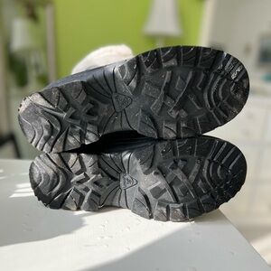 Cozy winter boots with durable black soles. Soft gray upper with plush lining. Perfect for cold weather.