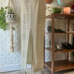 Vintage 90s Y2K Michelangelo Rhinestone Spaghetti Strap Gold Crochet Sequin Gown