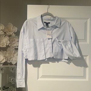 Stylish cropped shirt. Button-up front. Long sleeves. Perfect for casual wear.