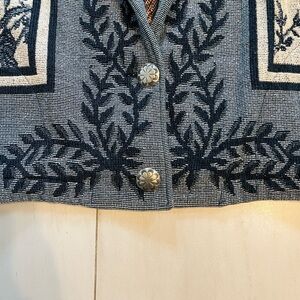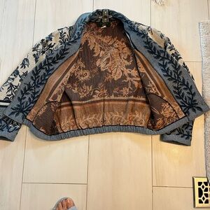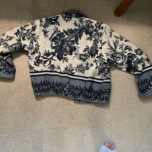 Stylish varsity jacket with intricate floral patterns. Features a button-up front and a comfortable fit. Perfect for casual outings.