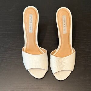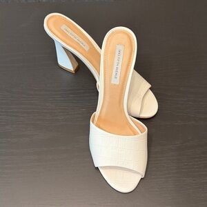Elevate your "Quiet Luxury" aesthetic with these stunning Saks Fifth Avenue mule sandals. Featuring a crisp white croc-embossed leather texture and a contemporary sculpted architectural heel, these are the perfect blend of modern sophistication and classic style.