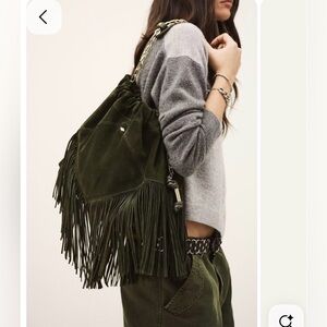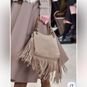 Elegant beige suede bag with fringe accents. Features a stylish adjustable handle. Real suede