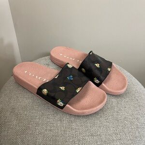 Elegant slides featuring a black floral pattern. Soft pink soles for comfort.