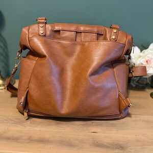Stylish Mominside Convertible Diaper Bag Backpack in warm brown vegan leather & nylon. Designed for real life with tons of storage and smart organization. Converts easily between shoulder bag, crossbody, and backpack for hands-free convenience.