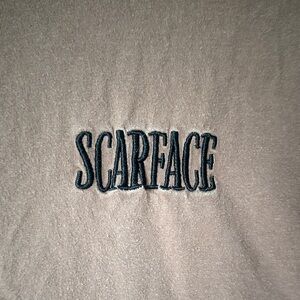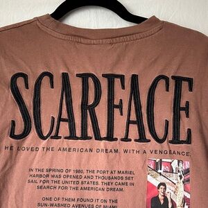Showcase your love for classic cinema with this Scarface graphic tee. The rich brown color and bold design make it a standout piece for any casual occasion.