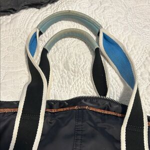 Stylish Coach tote bag. Features black exterior with blue accents. Signature pattern inside. Durable and chic.