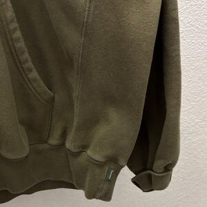 Dark olive Supreme hoodie with kangaroo pocket and drawstring hood.