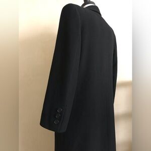 Fabric probably has wool fibers. Coat has two slit pockets and shoulder pads.