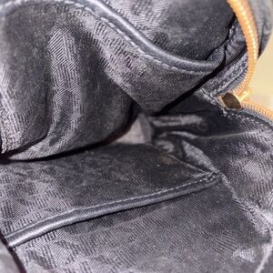 Authentic Michael Kors black quilted leather mini backpack featuring gold-tone hardware, dual zip compartments, adjustable straps, and top handle. Quilted leather exterior with MK logo lining interior.