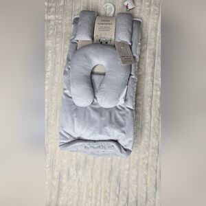This is a cozy baby blanket and pillow set. The soft, plush gray fabric has a delicate floral print, creating a soothing, gentle aesthetic. The supportive pillow matches the blanket, providing comfort and relaxation for a baby. This well-made set seems almost new and would make a wonderful addition to any nursery. New with tag