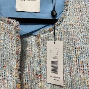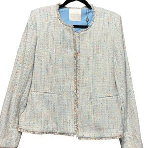 Elie Tahari Light Weight Tweed Blazer Light Blue Metallic Frayed Trim