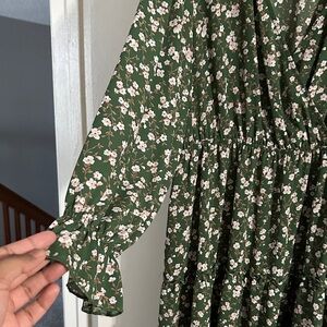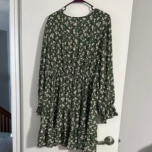 Charming green dress with floral pattern. Features long sleeves and a flattering fit. Ideal for versatile styling.