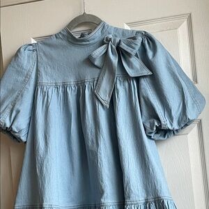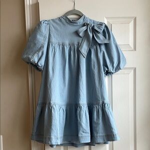 This chic light blue denim dress features a charming bow accent. Adorable! EUC. Worn once.
