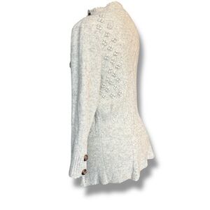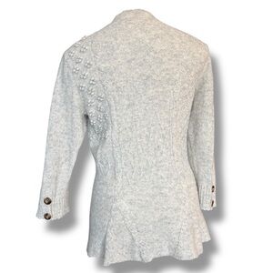 Beautiful and highly sought-after Anthropologie Moth sweater featuring intricate knit detailing and rich texture throughout. This piece has a romantic, boho aesthetic with dimensional bobble accents and statement tortoiseshell-style buttons at the shoulder and cuffs.
