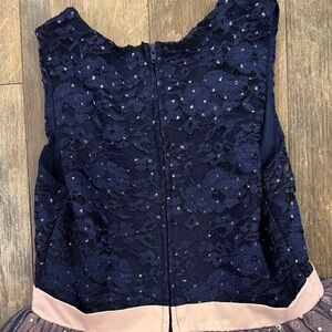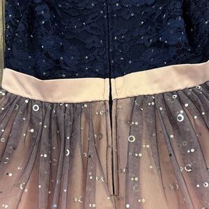 Elegant kids dress with a navy sequin top and flowing pink skirt. Perfect for formal events.