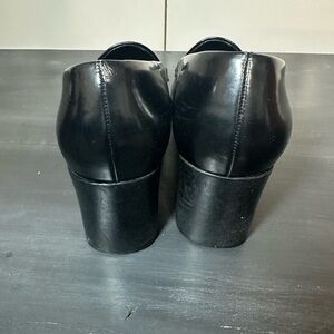 Franco Sarto black loafers with a glossy finish. Very little wear. EUC. Leather upper. Man made sole. Size 9.5. 2.5” block heel.