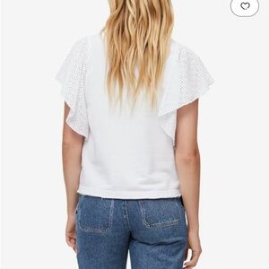 Pullover style. Round neckline and short flutter sleeves. Eyelet embroidery all along the sleeves and ruffled extensions along the front sides. Straight hem. 47% cotton, 47% Modal, 6% spandex. Machine washable.