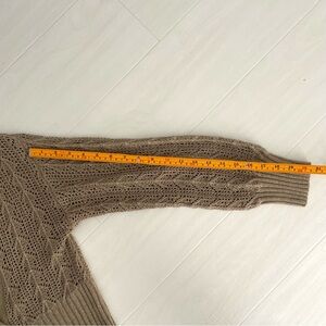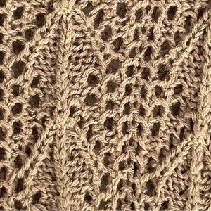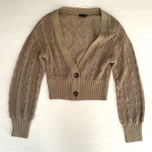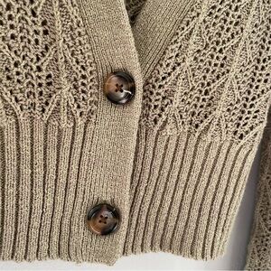 Preowned Wild Fable cotton blend cardigan in a beautiful neutral tan shade. This lightweight knit features an intricate open-knit pattern with a flattering deep V-neckline and two statement buttons down the front. The cropped silhouette and fitted ribbed hem create a flattering, waist-defining shape.