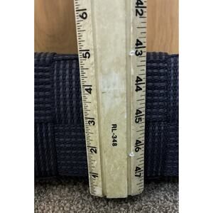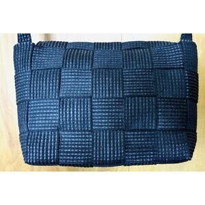 Black Fabric Woven Italian Seatbelt Style Flap Front Snap close bag. Photos show strap drop and bag size. Black fabric lining