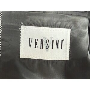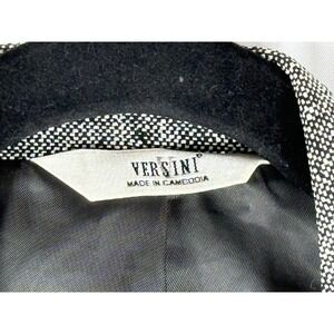 Vintage Versini blazer features a luxurious 100% silk shell with a sophisticated salt and pepper tweed pattern in grey and black. This two-button sport coat is designed with a classic notched lapel, a single back vent, and a fully lined interior for a smooth fit. It includes a chest welt pocket and two front flap pockets, offering a timeless aesthetic suitable for professional or formal occasions.