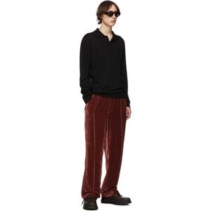 Long sleeve knit wool polo in black. Rib knit spread collar, cuffs, and hem. Three-button placket at front. Nylon-blend satin panel at back. Signature hardware at back collar. Asymmetric hem.
